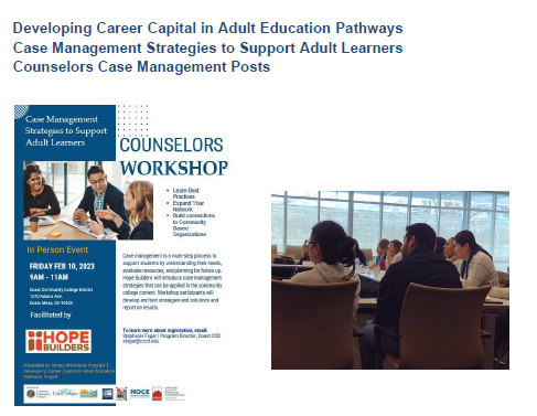 Case Management: Student-Centered Approaches and Facilitated Problem Solving Workshop - Case management is a multi-step process to support students by understanding their needs, available resources, and planning for follow up. Participating counselors collaborated with Hope Builders through a workshop and coaching sessions to define robust and intensive case management strategies that can be applied in the community college context. Working with Hope Builders counselors addressed the following questions: (1) What lenses can adult education practitioners use to better identify student needs and facilitate problem solving? (2) How can practitioners align these student-centered strategies in the context of their programs? (3) What models/scenarios from California Adult Education Program (CAEP) and individual practice can be applied? Through this work, counselors developed and shared examples and best practices that can be scaled up regionally. Participants assessed strategies and solutions and reported on results. Examples of the Case Management Posts were shared through the Orange County regional consortium and the regional adult education network.